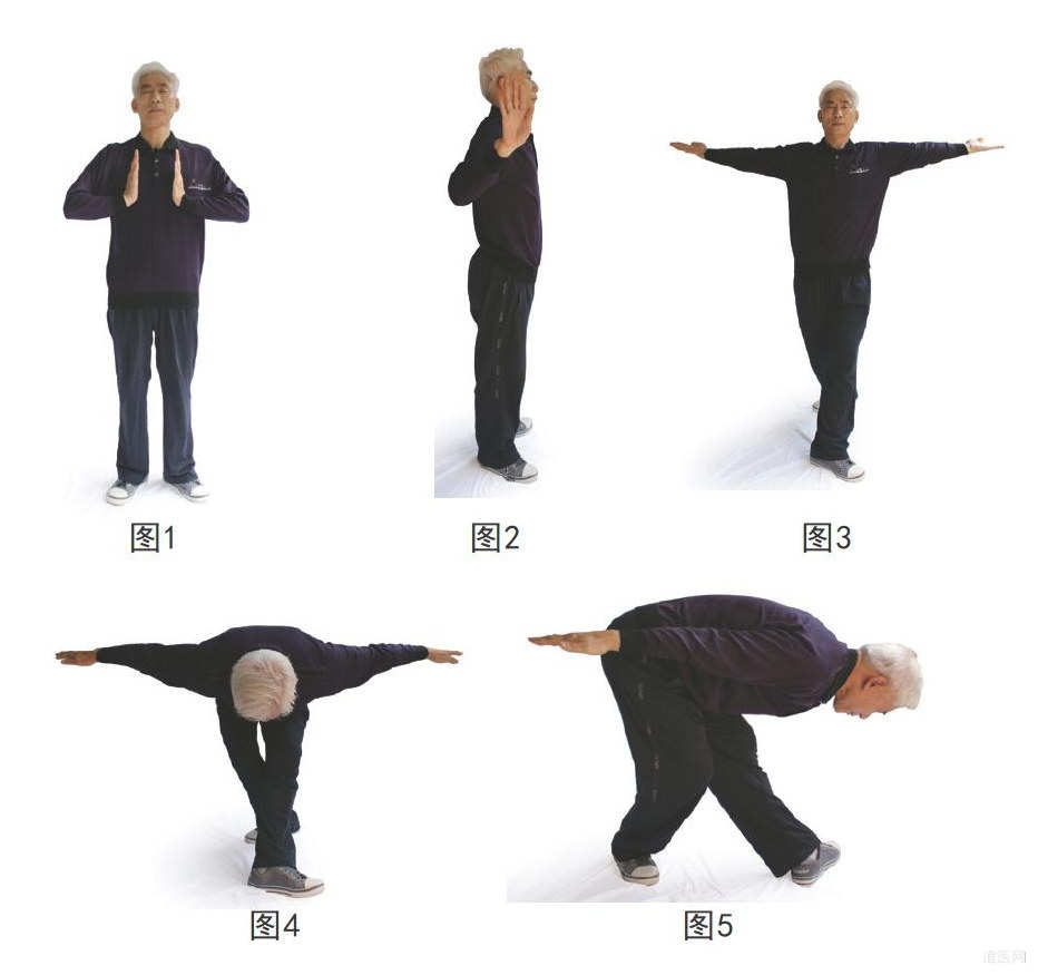 (4)单腿独立,膝与踝关节旋转运动:身体姿势——先左腿屈膝独立,右腿提膝使脚尖点地,左臂屈肘仰掌,右手握着左手,四指向下扳压。