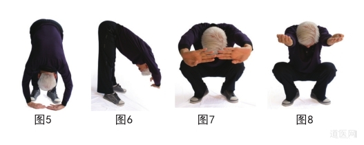 4.脚跟着地,上身不动,双臂与头部一起向前俯倾至双臂成水平状时停止不动。双掌握拳,拇指在内,四指在外。然后先吸气,呼气时上身开始向前俯倾(再吸气时要减缓向下的速度或暂停向下弯腰,再呼气时继续向下弯腰。向下俯倾时要多注意腰部的变化),至腰部大约与双腿成90°时,缓慢使劲抓握双拳,屈膝下蹲(图6)。下蹲至膝部约成120°时停止下蹲,再使劲抓握一下双拳,然后伸直五指。双腿继续屈膝下蹲至膝部成90°。五指张开,使劲往外抻拔2~3秒钟(图7)。五指并拢,屈腕屈指变成指尖朝下(图8)。双臂向下摆动至腿外侧,指尖朝后,保持头部低垂(图9)。