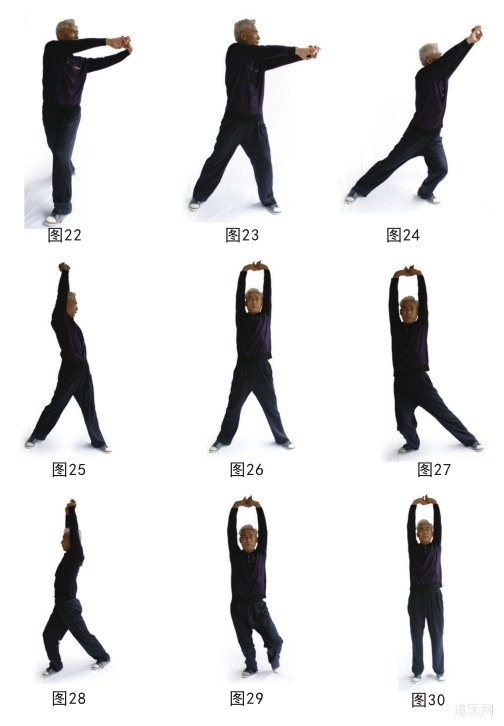 22.双臂不动,上半身向后移动,身体重心落到右腿上,右腿屈膝,左腿伸直。双掌向两侧平移至肩部前方(图24)。左脚跟略向侧平移。转动前臂使双掌掌心相对(图25)。上半身再次向后移动,上身体重几乎全部落到右腿上,右腿屈膝,左腿伸直。