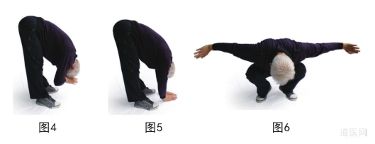 2.弯腰俯身至腰与腿部呈90°。双膝挺直(图2)。双掌向外移开一拳大小,随即指尖向前、向外转动变成指尖朝前,双掌与肩等宽。上身第二次向下弯腰俯身到最大限度。双掌向两侧平移至肩外侧(图3)。上身第三次弯腰俯身到最大限度。双掌向外平移至双臂将伸直时各向外转动90°,使双掌与双臂成一字展开,指尖朝外。双臂向外抻拔一下。上身第四次弯腰俯身到最大限度。接着双掌从腕部向下屈折(图4)。上身第五次弯腰俯身到最大限度。双臂向下合抱,腕部保持向内屈折,肘部稍弯曲,双臂向内收拢至中指指尖相接(图5)。上身第六次弯腰俯身到最大限度。如果此时腰部不能动也要保持向下俯倾,停留几秒钟(下同)。双掌上升至胸前,中指指尖相接触。第七次弯腰俯身到最大限度。随即双掌反转成阴掌,保持中指指尖相接触,第八次弯腰俯身到最大限度。接着双掌向前平推至额头外,头部低垂(图6)。